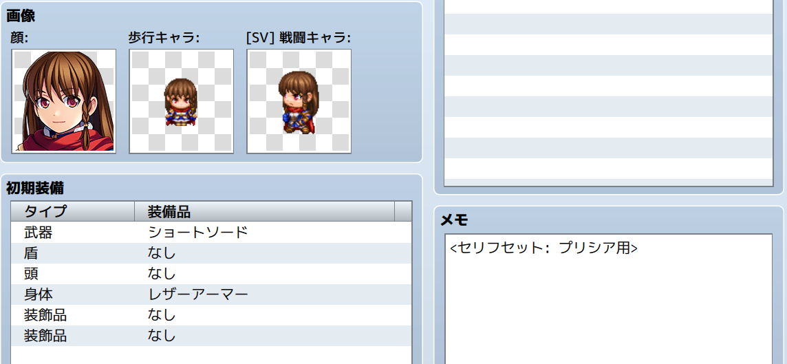 登録したセリフセットを使わせたいアクターや敵のメモ欄に以下のように記入してください。 プリシア用 の部分には先ほど登録したセリフセットIDを指定してください。