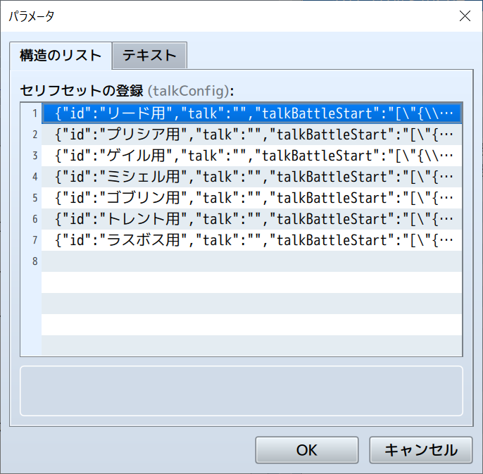 「セリフセットの登録」を選び、「構造のリスト」から「テキスト」のタブに切り替えると表示される入力欄に以下のサンプルをまるごとコピペしてください。