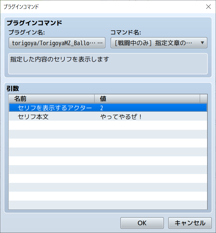 イベントコマンドのプラグインコマンドから、ゲーム中にキャラに設定されているセリフセットを別のものに切り替えることができます。