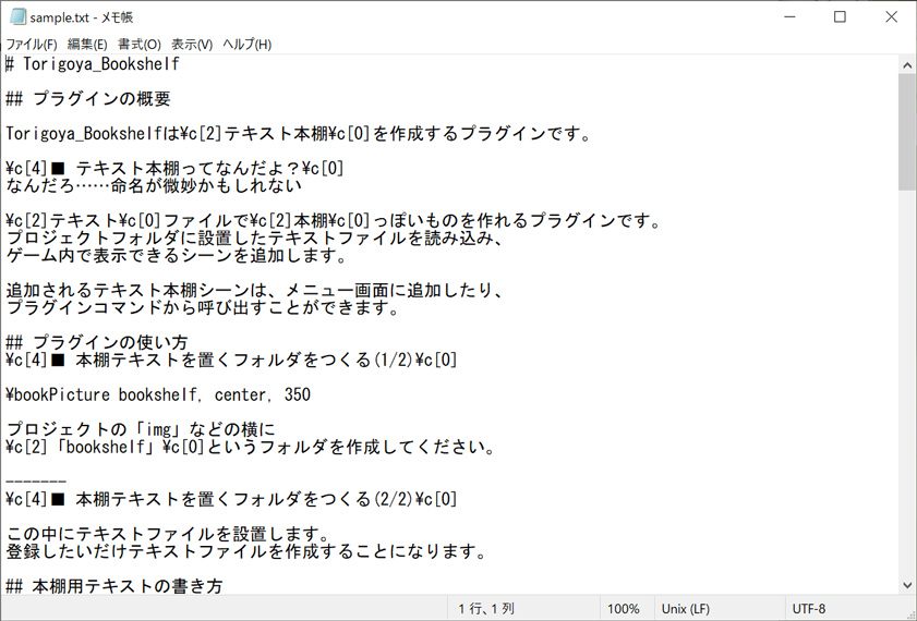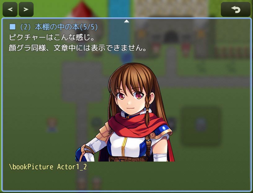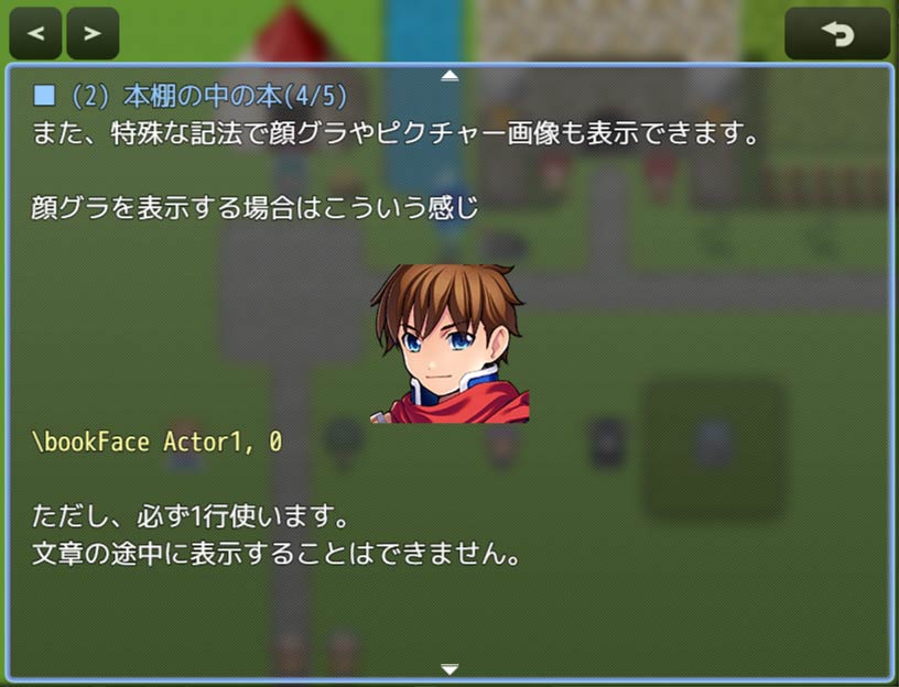 本の中身はイベントの「文章の表示」と同じ記法が使えます。