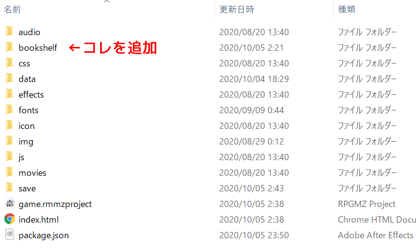 ゲームのプロジェクト内に bookshelf という名前のフォルダを作成してください。